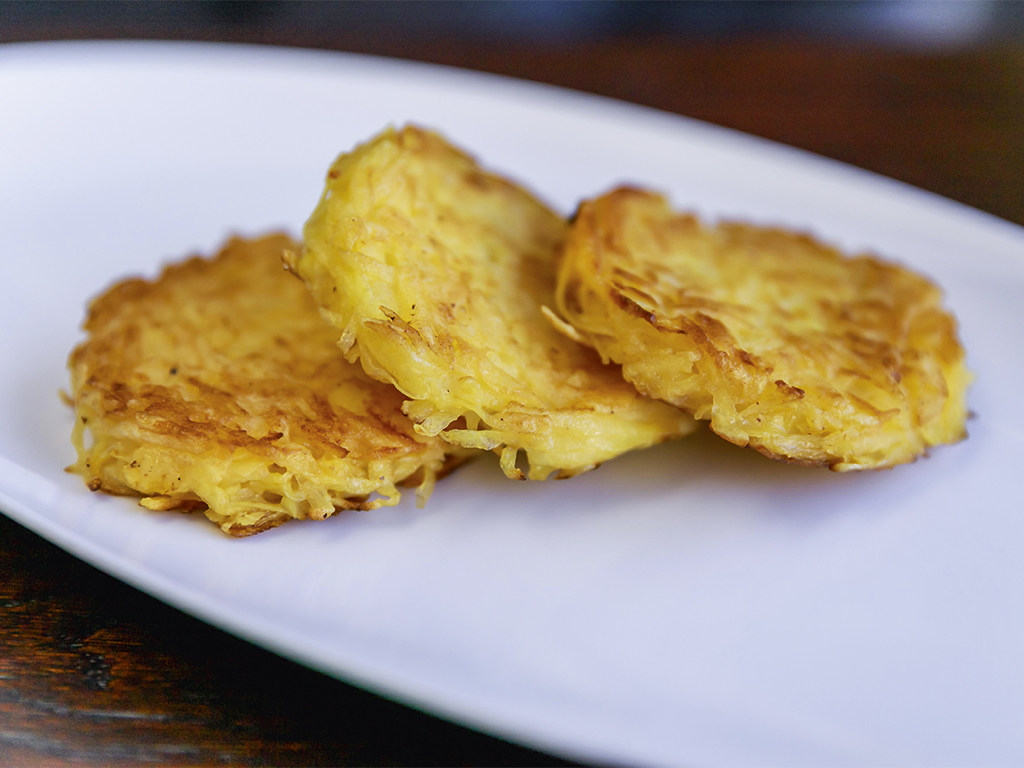 Kartoffeln waschen, schälen, grob raspeln. Mit Salz, Pfeffer und Muskat vermischen und in Taler von ca. 8 cm Durchmesser [...]